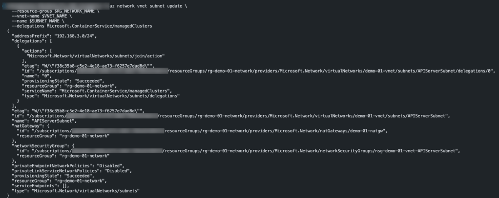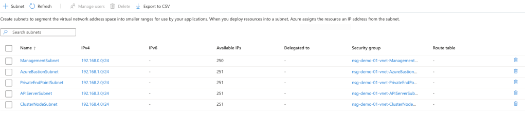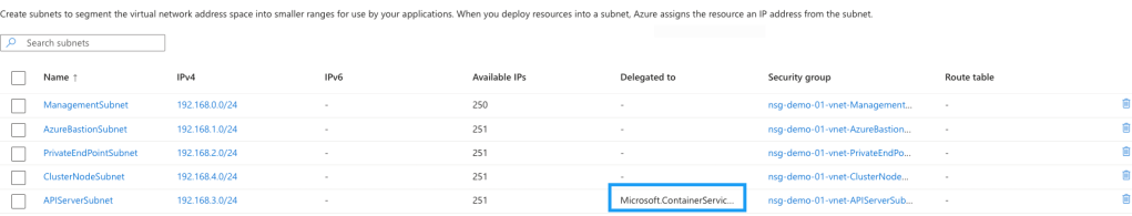 After refreshing the subnet page, you can see that the APIServerSubnet has now been successfully delegated.