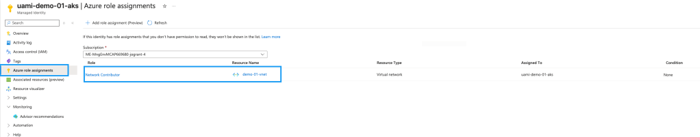 - Network Contributor built-in role assignment on the API server subnet